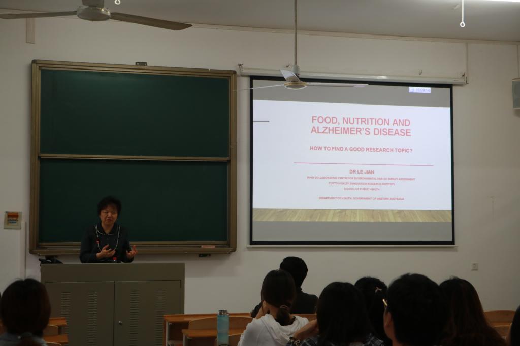 (食品科学技术通讯员 陈欢 供图 陈欢 李萌)2019年10月14日下午16:00,西澳洲卫生部高级研究员和分析师、科庭大学公共卫生公司客座教授JIAN LE 教授在一教303做了一场主题为“Food, Nutrition And Alzheimer's Disease”的精彩学术报告。报告由胡筱波教授主持,伟德官网多名硕士生参加了此次会议,现场师生积极互动,学术氛围浓厚。