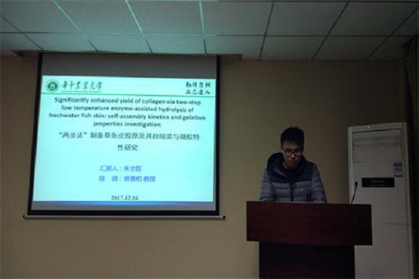 在此次汇报中,朱士臣同学首先向大家介绍了鱼源胶原相比哺乳动物来源的胶原所具有的较高安全性、低免疫性、适用广泛性等优良特性;以及目前对草鱼源胶原提取研究方面的不足,即单一法提取导致部分胶原未被提取,且提取条件繁多,过程复杂。据此,汇报人提出,通过两次提取法对比胶原得率,从而得到胶原提取的最佳工艺;并对酶溶性胶原和酸溶性胶原的结构特征、成纤维动力学、凝胶特性等指标进行对比分析,为后续加工提供指导。最后,汇报人指出,相比大部分文献中报道,采用两步法制备草鱼皮胶原能取得较高的得率。在学术研讨环节,多名同学就酶液的选择、氨基酸的切入位点等方面积极提出问题并发表自己的可行性建议,朱士臣同学一一进行解答。
