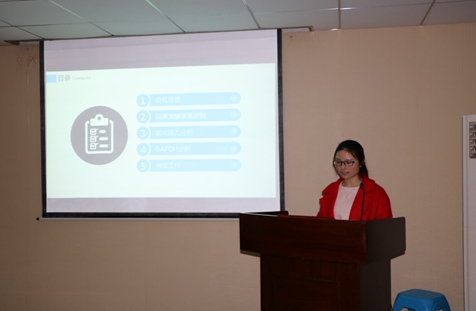 胡兰兰同学本次汇报内容分为研究背景、研究内容、研究结果、结论、展望和现场提问解答六个部分。首先,她从中国果酒产业的现状,非酿酒酵母在果酒中的作用,非酿酒酵母目前在果酒中应用的现状,以及酿酒酵母与非酿酒酵母间的互作关系做了扼要分析,且详细地阐述了本次试验的研究现状及创新点所在。接着,胡兰兰同学就如何制备优良的隔离发酵装置,以及酿酒酵母如何对非酿酒酵母生长产生抑制作用做了详尽的叙述,并向大家展示了近期的实验结果与后续工作。最后,在学术研讨环节,多名同学就隔离发酵装置中透析袋截留分子量大小的选择、酿酒酵母抑制非酿酒酵母生长中氧化压力测定方法及抑菌物质的检测方法等积极地提出问题并发表自己的可行性建议,胡兰兰同学一一进行了详尽回答,并虚心地接受了大家提出的建议。