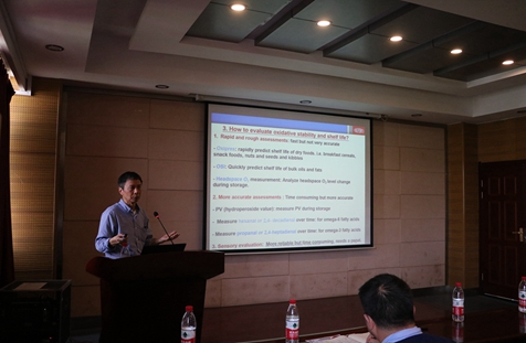 胡敏博士首先简要阐释了脂类氧化的原因及氧化机理,并介绍了抗氧化剂的类型和应用,常用的防止脂类食品氧化的方法有充氮、真空包装、避光低温保存等、钝化氧化剂等。随后,胡敏博士向大家展示了他们科研团队近些年来的主要研究内容和成果,包括快速测定脂类氧化的程度、如何评价氧化稳定性和食品货架期。由于化学检测并不能完全说明各感官元素的相互作用,故胡敏博士向大家重点强调了使用感官评价的方法来评定食品的品质好坏,该方法在食品行业中有着不可替代的作用。最后胡敏博士列举了脂类氧化在各类(坚果、葵花籽油、焙烤食品、挤压食品、饮料、调味料等)食品中的具体应用。