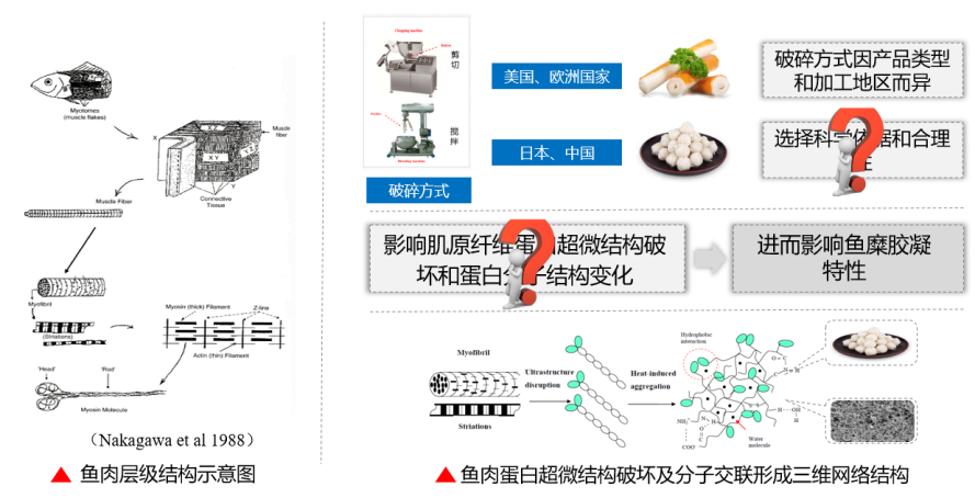 鱼糜制品是以新鲜鱼肉或冷冻鱼糜为原料,加入食盐和其他配料,经破碎、成型、加热制备的一类凝胶态食品。破碎是加工鱼糜制品的一道必要工序。典型的破碎方式包括剪切、擂溃和搅拌。鱼糜制品的破碎加工工艺在不同的国家和企业,随着其成品属性不同而有所不同。鱼糜破碎效率和胶凝性能的变化可能与在不同破碎方法下鱼类肌肉超微结构和肌原纤维蛋白生化特性的变化有关。但是,目前还未见与之相关的文献资料。白鲢鱼是世界上用于生产鱼糜的主要淡水鱼种。本研究的目的是比较研究两种破碎方式(搅拌和剪切)对白鲢鱼鱼糜肌原纤维超微结构和生化特性(包括表面疏水性、Ca2+-ATP酶活性、表面活性巯基、浓度和二级结构)和胶凝特性的影响,以期阐明破碎方式对鱼糜制品品质影响的机制,为优化鱼糜制品加工工艺、改善制品品质和促进水产品企业加工能力的提升提供科学理论依据。