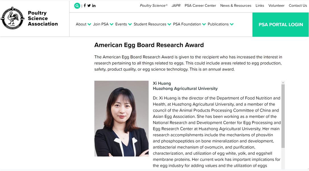 近日,从美国家禽科学协会(Poultry Science Association PSA)获悉,公司伟德官网黄茜副教授获得PSA的2021年度禽蛋研究奖(American Egg Board Research Award),以表彰她在禽蛋蛋白质联合提取、结构功能及活性成分高值化利用方面取得的研究成果。