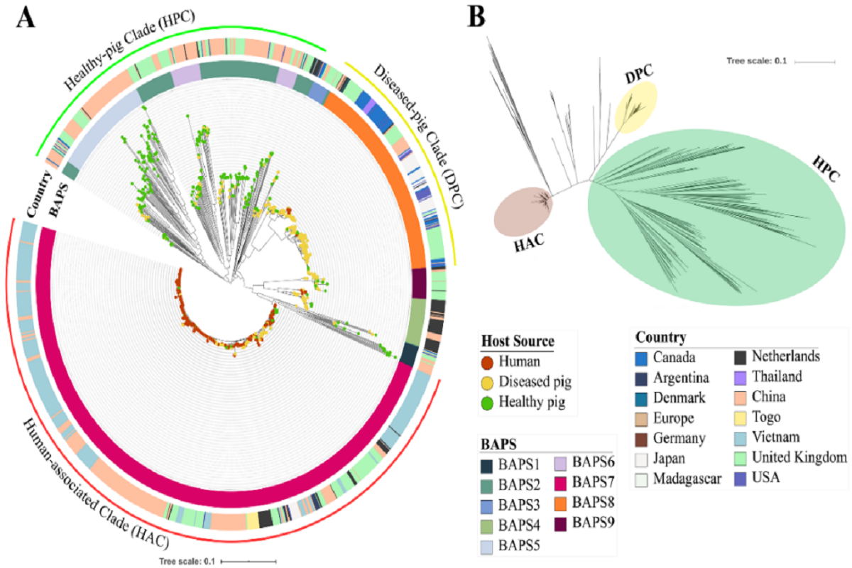研究人员对全世界1634 个菌株的全基因组数据进行了比较基因组学分析,揭示了 3 个与宿主密切相关的种群结构,分别为人类适应性菌株组(HAC,Human-associated Clade)、健康猪组(HPC, Healthy-pig Clade)和病猪组(DPC, Diseased-pig Clade)。研究发现,HAC组的菌株来源于9个不同的国家,说明该类型的菌株已经在全球进行传播和扩散,其中在亚洲形成3个平行进化的流行性支系(Ⅰ、Ⅱ、Ⅲ),其中支系Ⅰ为引起了中国的两次大爆发的中国特有序列型——ST7菌株;支系Ⅱ为ST1型菌株组成,该支系的菌株携带一个与89kb高度类似的78kb的毒力岛,正在中国和越南之间传播;支系Ⅲ为新型的ST7菌株,该支系的菌株携带一个含多类抗性基因的127kb的耐药岛,目前已经在中国境内多个省份发现。支系Ⅱ、Ⅲ为本研究新鉴定的2个支系,需要引起我们高度重视。