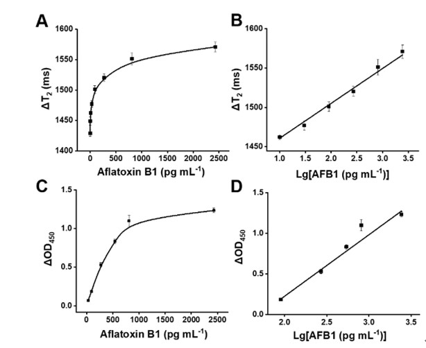 本工作首先对所合成的Au-Fe3O4纳米颗粒进行了表征(图2),并通过TEM、能量色散谱、动态光散射、紫外吸收等手段验证了过氧化氢介导的Ag@Au-Fe3O4组装过程(图3)。基于该信号传感策略,构建了磁弛豫免疫传感器,将其应用于黄曲霉毒素B1的快速检测。实验结果表明,本MRS传感器对黄曲霉毒素B1的检测限为3.81 pg/mL(图4),比ELISA法提高了约21倍,并在实际样品检测中与HPLC方法具有良好的一致性,说明本MRS传感器具有较高的灵敏度和良好的稳定性。