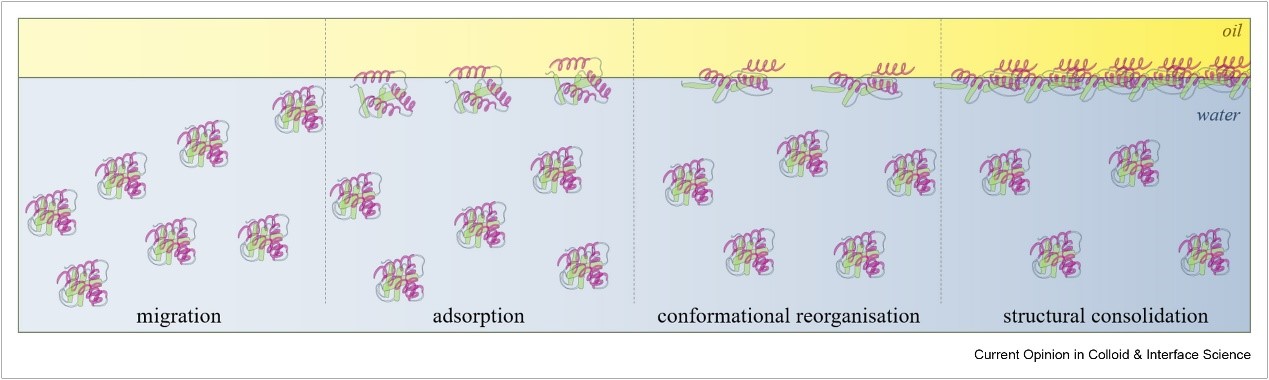 在蛋白质稳定的两相系统中,除了降低表面张力外,蛋白质在气泡或油滴周围形成连贯的粘弹性薄膜,从而稳定分散体,防止凝聚。即使大多数蛋白质是两亲性的,但由于二级和三级结构的分歧,它们的表面活性也不同。在短时尺度上,蛋白质的吸附受到扩散的调节。然而,在长时间尺度上,被吸附的蛋白质分子需要克服表面压力和静电能量障碍,将自己固定在界面上。吸附后,蛋白质的构象会从其自然状态发生变化。研究发现,与球状蛋白相比,灵活的随机卷曲蛋白在吸附后在界面上重新排列的速度明显更快。当疏水侧链向流体界面的非水侧转移时,分子重新排列发生了,导致球状蛋白分子的部分解折叠。因此,吸附后构象改变的程度和速度主要取决于蛋白质分子的构象稳定性。
