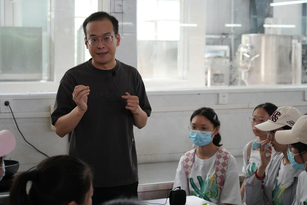 尹涛老师依据两条中试生产线介绍了水产品加工和粮油加工。现场提问同学“水产品/粮食类有哪些”,老师与员工现场互动增加了知识趣味性。随后他详细介绍从鱼皮鱼鳞里面经酶解、脱色、脱盐、喷雾干燥得到胶原蛋白钛的过程。盛龙老师则通过蛋制品生产线的介绍,让同学们了解到鸡蛋不仅可以保留原始状态加工,还可以打破重新组建,蛋壳中富含钙元素,生产机钙产品。