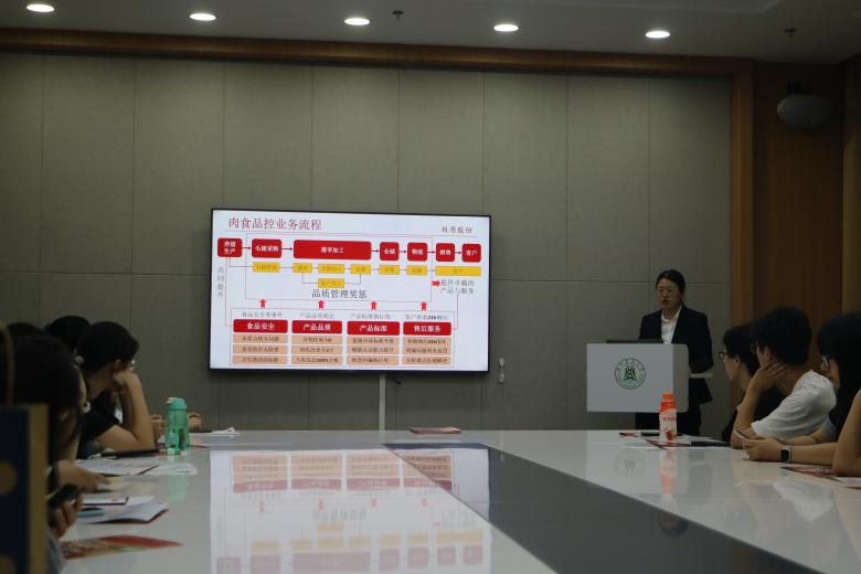随后牧原股份品质管理负责人李永华牧原肉食食品安全负责人王静分别对公司养殖品控和肉食品控业务情况进行全面介绍李永华表明公司需要做出性价比最优的产品,与客户实现双赢。并且强调产品质量的稳定性和卫生性必须使生产出的产品严格依据国家标准和行业标准,致力于为消费者提供品质更优的产品。王静从占比和集中度介绍了屠宰行业现状,阐明了公司需要推动行业升级,让消费者满意的目标两位负责的详细阐述,同学们对牧原公司的品控业务有了更加清晰全面的了解。