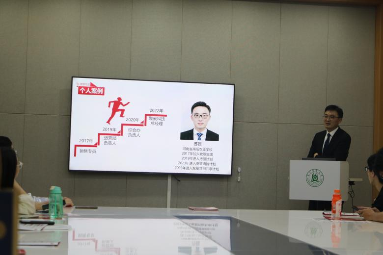 下来,聚爱科技总经理苏磊对牧原公司旗下重要板块——聚爱优选进行了重点介绍。苏磊提到,聚爱科技已通过ISO9001质量管理体系和ISO22000食品安全管理体系双认证的管理认证优势以及严选、严检、严控、严查、严究五严体系的品控优势同时苏磊以个人经历作为案例,详细介绍了自己的晋升之路,给现场参会的同学以深刻的启发和激励。