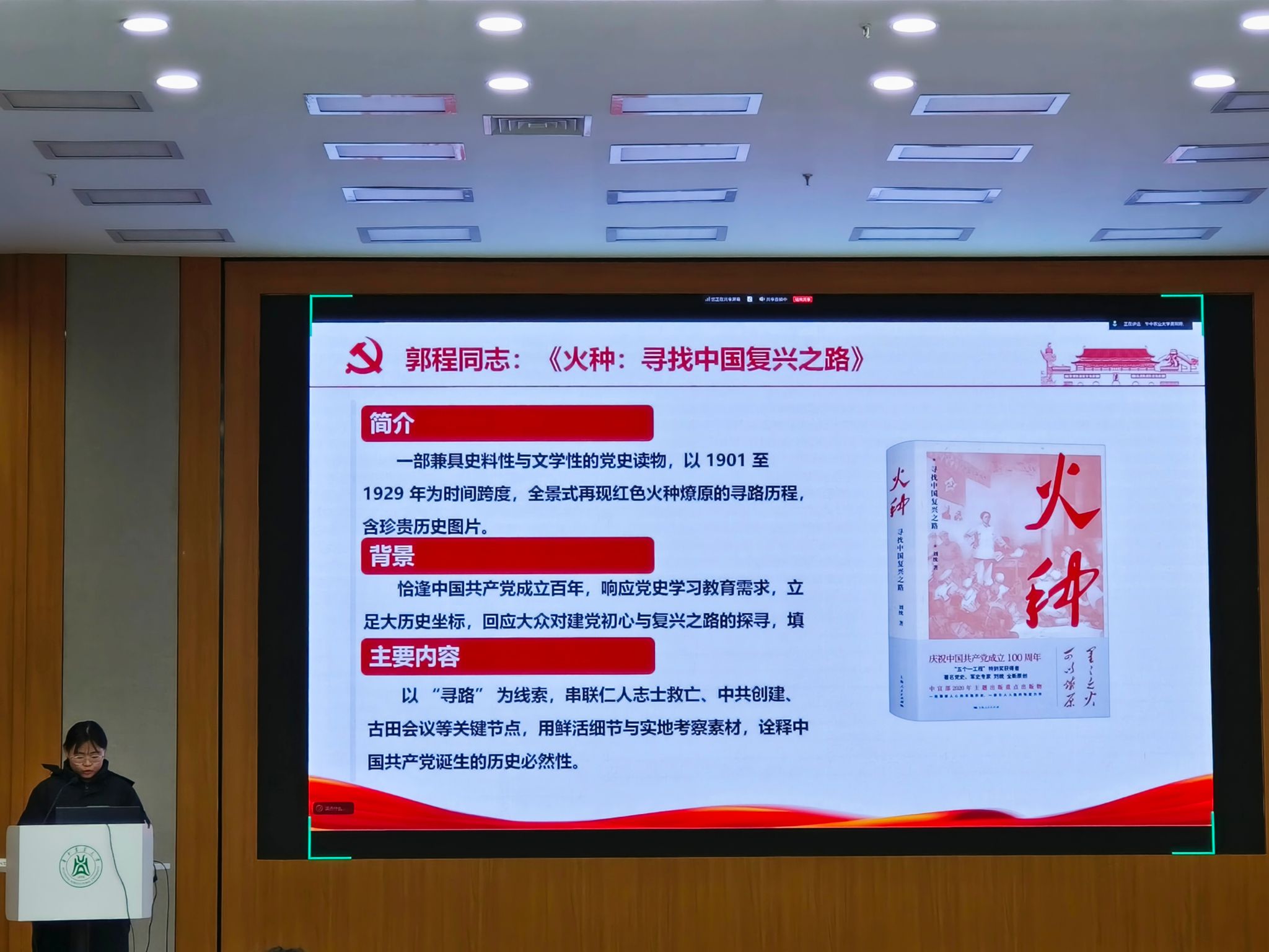 活动伊始,与浙大结对读书分享。龚琬婷同志介绍活动背景与结对共建情况。研究生第七党支部为首批全国“百个研究生样板党支部”,立足食品学科专业优势,通过运营“狮山食研君”抖音号、开展“食品安全与营养中国行”等品牌活动,坚持“党旗插在科研最前线”,形成了独特的“食研文化”。浙江老员工工食品公司食品生物科学技术研究所研究生第三党支部,秉持“党建引领科研,初心践行使命”的工作理念,组织开展“研途奋进传薪火”“优秀院友面对面”“红心护航心成长”等系列品牌活动,引导党员在科研学习与社会服务中践行使命担当。