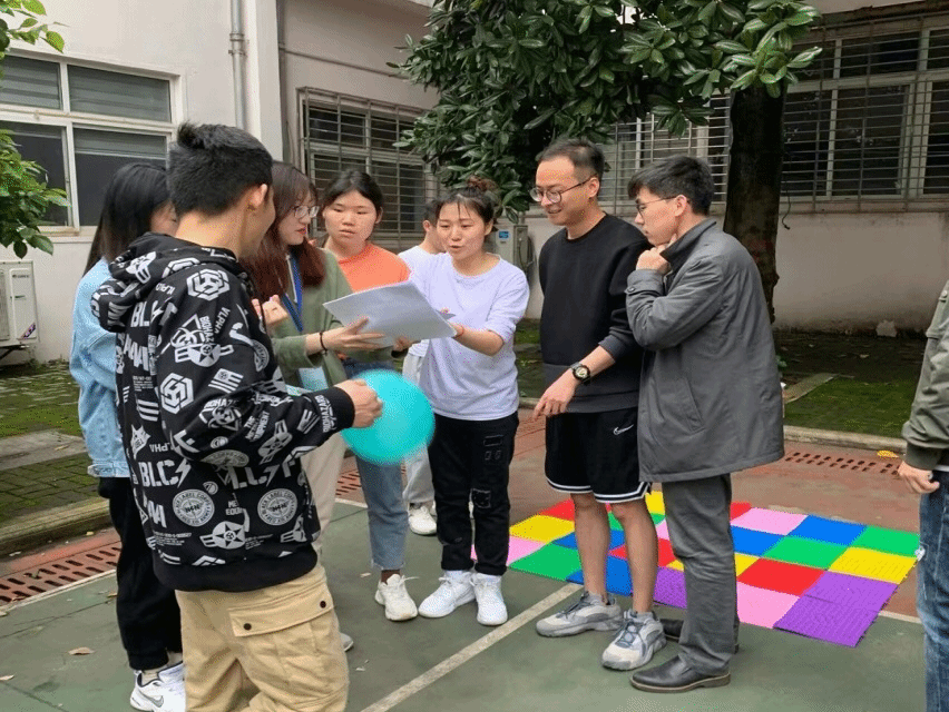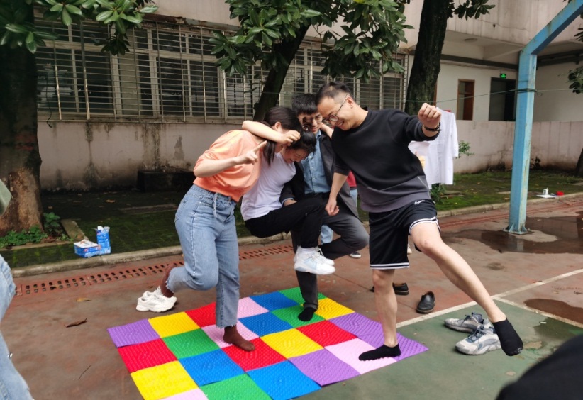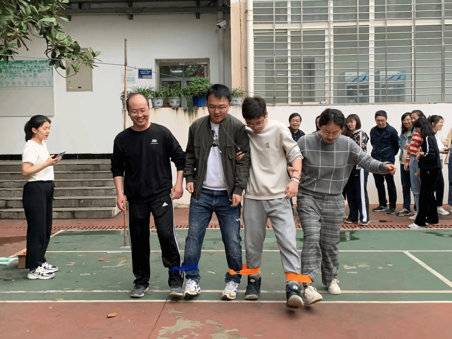 比赛开始前宋蓉老师做的第一件事情就是蹲下系紧鞋带,还一边说道“我可不能给员工拖后腿呀”,计时一开始,大家一齐喊着“一、二、一、二…”,手挽着手,相互配合着彼此的节奏,目光紧紧盯着脚下的每一步,一起迈步向前,一旁观赛的同学们给比赛队伍喊着加油,现场十分热闹。