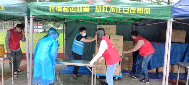 活动进行时,26日上午10点,武汉血液中心的献血车停靠在献血地点荟园食堂前坪。天空下起了暴雨,但负责主要任务的几位党员早已经到达工作岗位,帮助献血中心的医护人员进行准备工作并学习献血流程操作知识。