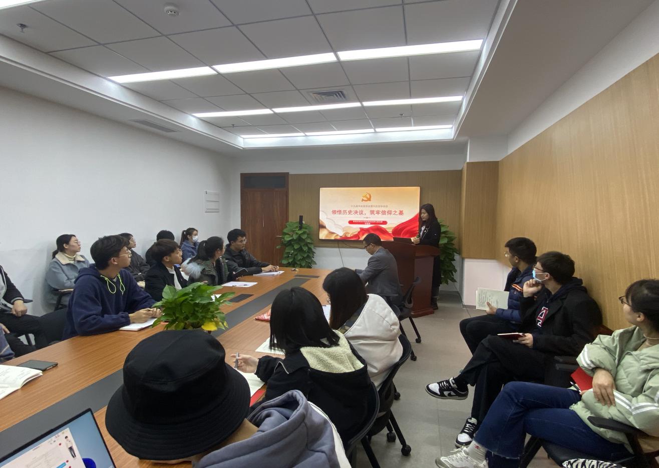 会议第二部分,支部李温蓉同志以“领悟历史决议,筑牢信仰之基”为题从青年的角度学习党的十九届六中全会精神。百年风云激荡壮阔征程,百年奋斗铸就世纪伟业,李温蓉从十九届六中全会召开的重要意义、十九届六中全会精神学习、青年党员的感悟三个方面进行深入分析。她感叹到,同我们写论文一样,十九届六中全会也有很多关键词,如百年奋斗、重大成就、历史经验、优异答卷等等。最后,她号召青年党员坚持党的领导,不忘初心担使命;强化学思引领,共创优良新学风;赓续优良传统,凝心聚力办实事。
