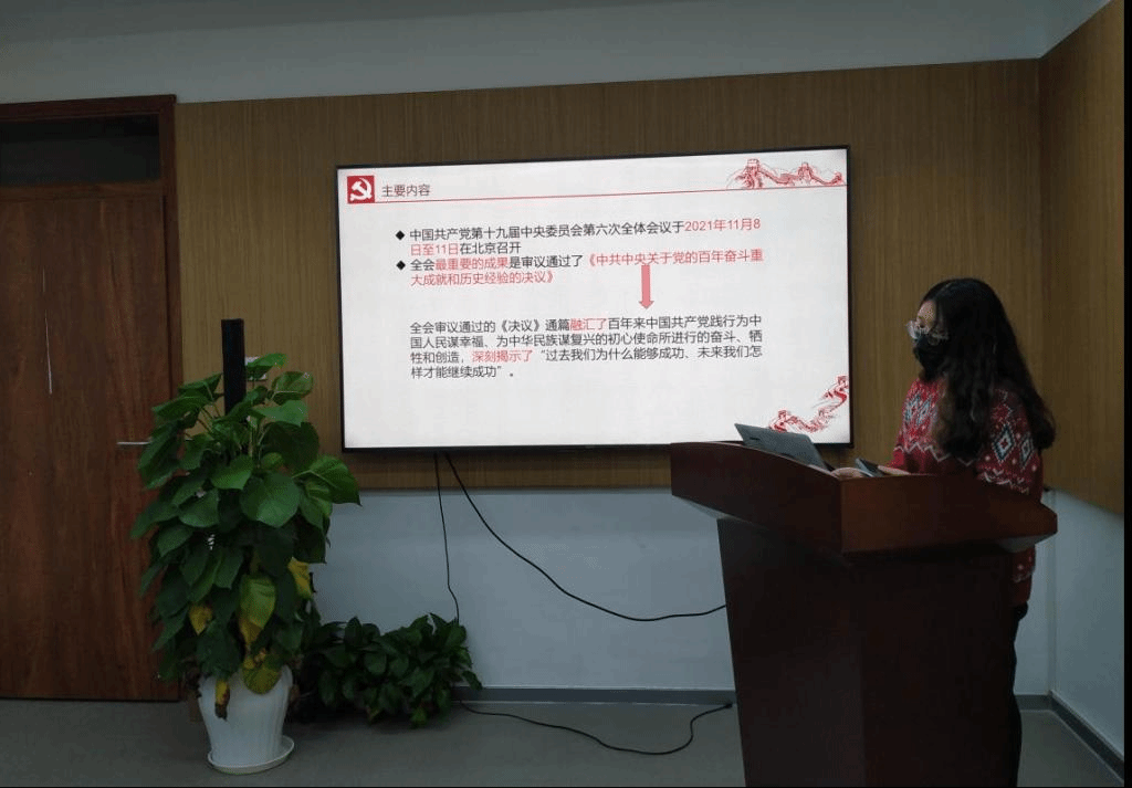 活动第一项主要围绕“学习党的十九届六中全会精神”展开。支部党员张星星为我们分享了《中共中央关于党的百年奋斗重大成就和历史经验的决议》内容。《决议》通篇融汇了百年来中国共产党践行为中国人民谋幸福、为中华民族谋复兴的初心使命所进行的奋斗、牺牲和创造,深刻揭示了“过去我们为什么能够成功、未来我们怎样才能继续成功”两个重要问题。《决议》以“十个坚持”总结党百年奋斗的历史经验,强调“两个确立”,对新时代党和国家事业发展、对推进中华民族伟大复兴历史进程具有决定性意义。