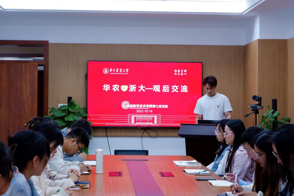食科支部党员就观看大会分享心得。博士党员陈博文谈道,今年是她走进食品专业的第九年,在奋斗的路途中,国家不断开创中国特色社会主义的新局面,能够与祖国同呼吸、共成长,倍感荣幸。学硕党员牛永鑫就自己参与食品安全与营养中国行的经历展开分享,人民的健康是幸福生活的重要指标,要始终把人民安居乐业、安危冷暖放在心上,用心用情用力解决群众关心的食品安全问题。新生党员黄俊恺说道,青年承载着国家的未来,作为研究生党员,应以科学和创新的主旨上好时代必修课,以矢志不渝的奋斗为人民服务,以上九天揽明月的意志阔步前行。