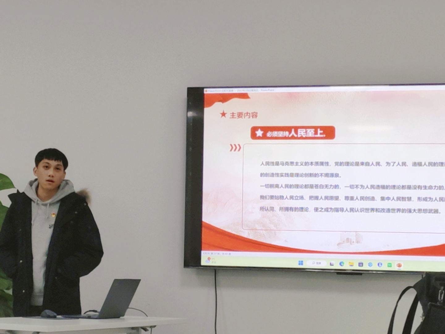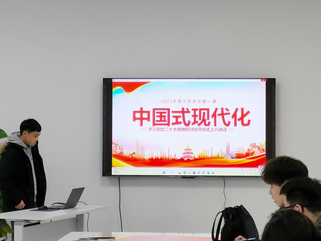 认真学习宣传贯彻党的二十大精神,事关党和国家工作全局,事关中国特色社会主义事业长远发展,事关最广大人民的根本利益。为引导研究生党员把思想和行动统一到党的二十大精神上,2月24日中午,伟德官网研究生第七党支部开展二月主题党日活动,共同学习习近平主席在学习贯彻党的二十大精神研讨班开班式上的重要讲话,并以此为基,更加深入地学习中国式现代化的本质特征以及“坚持人民至上”的理念。会议在工科楼120会议室进行,由研究生第七党支部书记丁一峰主持。