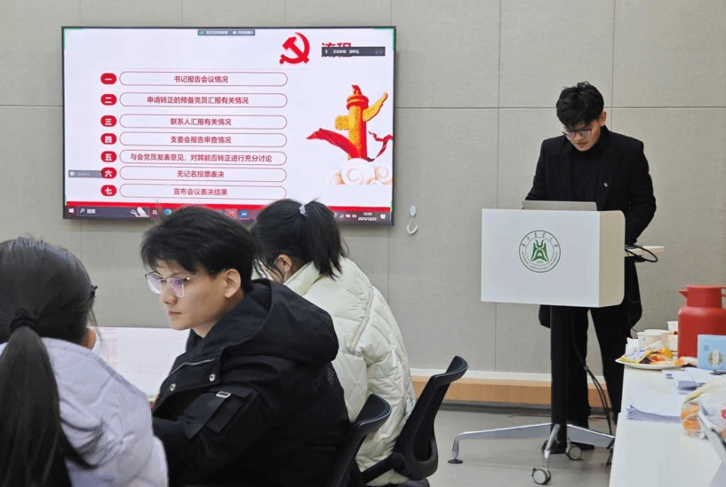 首先由苑祥昊同志报告出席会议的党员人数及注意事项,申请转正的预备党员徐亚伟汇报自己在预备期的表现,向党组织表明态度与决心,随后入党联系人介绍其在预备期间的教育及考察情况并提出转正意见。后经支委会报告预备党员在预备期间的相关情况并发表意见、与会党员发表意见、拟转正预备党员对讨论情况表明态度后,以无记名方式进行表决,支部党员大会同意徐亚伟同志转为中共正式党员。