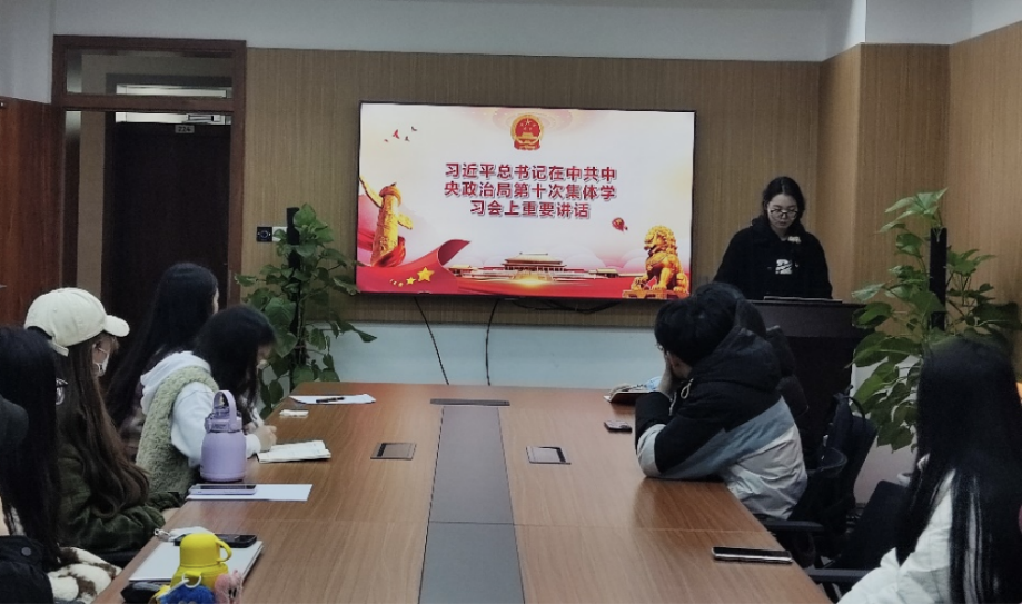 为培养党员们的法治精神,会议伊始,在刘超萍的带领下,支部党员们集体学习了习总书记在中共中央政治局第十次集体学习会上的重要讲话精神,深刻认识到“法律是社会生活、国家治理的准绳”,并体会到涉外法治的重要性。而后,周玥全同志结合学习内容表达了自己的感悟:“总书记的讲话系统地阐释了我国涉外法治工作的推进方式、原则立场以及根本目的,为涉外法治人才培养等涉外法治体系和能力的建设指明了前进的方向。”