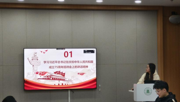 本次活动由研究生第七党支部第一党小组领学。会议伊始,程婕同志带领全体成员深入学习了习近平总书记在庆祝中华人民共和国成立75周年招待会上的重要讲话精神。讲话中,习近平总书记指出以中国式现代化全面推进强国建设、民族复兴,是新时代新征程党和国家的中心任务,并总结了75年来我们党团结带领全国各族人民取得的伟大成就。