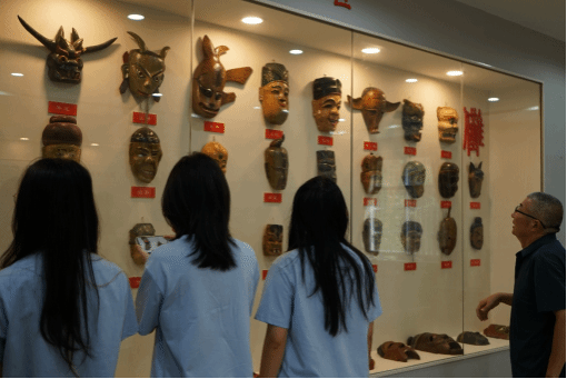 清晨,实践团抵达三岔镇综合文化服务中心,展厅内形态各异的傩面映入眼帘。工作人员吴奋明介绍,傩面是傩戏表演的重要道具,也是土家族文化的关键象征。当地选用轻重合宜的杂木作为傩面材质,这种木材不仅方便演员在舞台上挥洒自如地表演,还体现了土家族 “就地取材” 的生态理念。