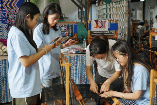 傍晚,实践团深入西兰卡普生产基地,就这项国家级非物质文化遗产的织锦技艺开展实地调研。“中国优秀织锦工艺传承人”“荆楚工匠”田若兰在基地热情接待了实践团,并现场展示织锦技艺。她指尖翻飞间,五彩丝线在织机上灵活穿梭,短时间内,精美的图案便在布匹上逐步显现,让实践团成员直观感受到非遗织锦技艺的独特魅力与传承活力。