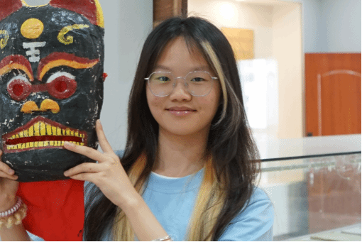 团队成员章思叶试戴感受傩戏面具 黄蔚然摄