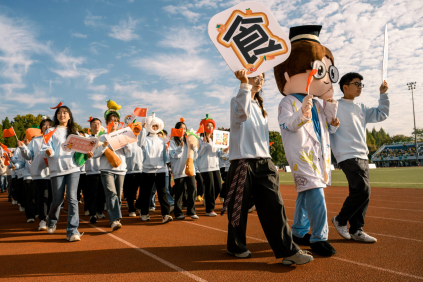 广播操表演落幕,开幕式进入方阵巡游环节。各公司员工、教师运动员及裁判员方阵迈着坚定步伐依次入场,不同特色的展示让现场氛围持续升温。公司方阵登场时,“智慧食科,致胜时刻,拼搏勇敢,青春如歌!”的口号响彻运动场,成员们头戴色彩鲜艳的蔬菜水果造型头套,手持飘扬的小红旗和KT板,与标志性的“食博士”形象人偶并肩前行——这一设计紧扣“健康饮食、体重管理”的巡游主题,将学科元素与主题创意相融合,让在场师生直观感受到食品科学与日常生活的紧密联结。