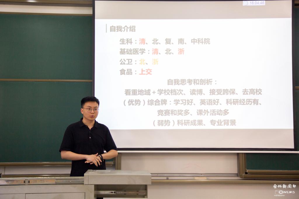 第一位进行分享的是陈昊泽,他首先向大家介绍了保研的基本流程。在谈到保研方向时,他建议大家先进行自我评估,对自己侧重的集团客观条件进行考量,再来选择自己心仪的公司。陈昊泽将保研准备的过程比喻为“一场信息搜集战”,即从目标公司的官网、公众号等平台来获知相关信息。针对申请材料的准备阶段,他建议道:“简历一定要简洁,篇幅控制在一页之内,让人一目了然。”面试阶段分为自我介绍、自身科研经历、个人问答、外文文献朗读和翻译四个部分。他表示中、英文和不同时长的介绍都要提前准备好,并提前演练个人问答。对于最后的外文文献的朗读和翻译部分,他建议同学们多积累专业词汇。