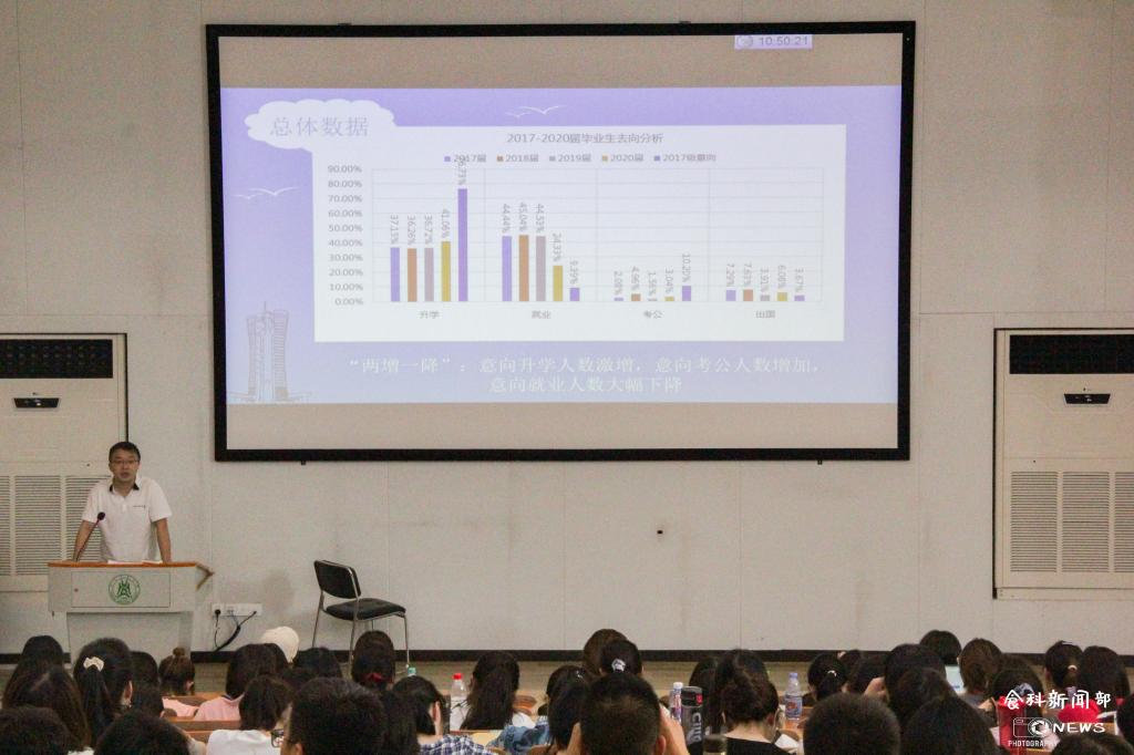 随后,邵晋辉对近四年公司毕业生去向进行了分析,并对同学们后续的个人规划给出了建议与指导。根据公司2017至2020年的数据,他向大家总结了近年来毕业生去向“两增一降”的趋势——意向升学人数激增、意向考公人数增加、意向就业人数大幅度下降,并从“升学”“考公务员”“就业”等四个大类进行了详尽的讲解与分析。