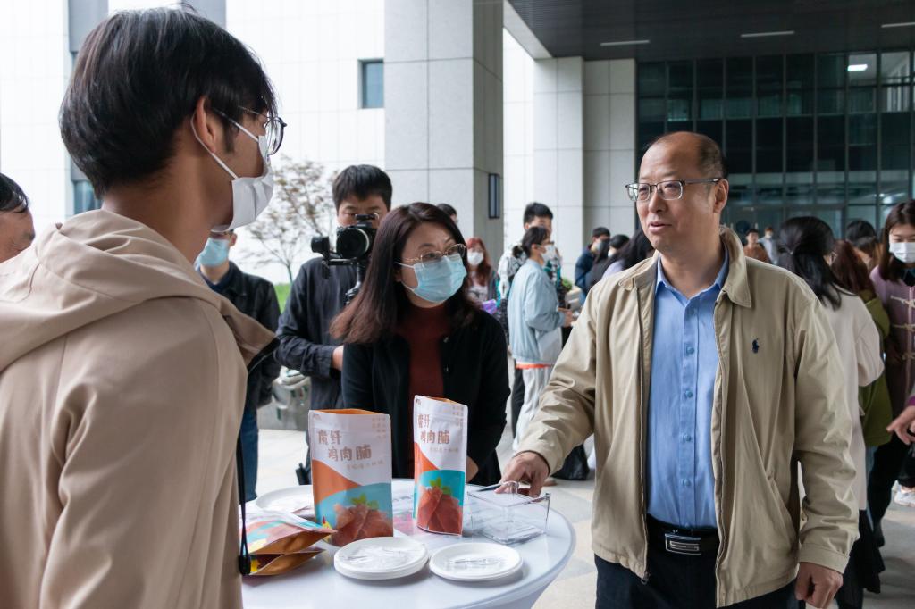 创新赛事推动产教育人双提升。2022年“扬翔食品杯”肉类主题加工创意大赛以“安全、健康、美味”为主题,为培育食品工业创新人才,增强员工动手实践能力,开发具有创新性及商业价值的健康产品提供了平台。其中“棋鱼记”将鱼鳞变废为宝,做到了“低糖、低钠、低脂”的健康特点。“只‘薯’于肉,香香脆脆肉多多”则混合了鸡、鱼、肉,形似薯片,具有香香脆脆的口感与独特的创新设计,进一步实现了商品化的可能。在活动现场同步进行的食品营养与健康新专业推介直播也吸引了线上线下的大量观众,公司研究生院常务副经理、教授李斌以食文化节为依托就新专业的团队力量、学习内容、专业优势、深造方向等方面与线下同学和线上网友热切交流。