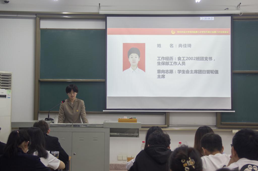 会议期间,五位主席团候选人进行公开竞选演讲。他们分别从工作经历、自身优势、感悟体会、未来规划等方面进行发言。候选人赵南鹏表示员工干部要为同学们发声,完成好上传下达的工作任务,成为公司与同学之间的桥梁。尚佳琦则对如何打破对五查部门的刻板印象,扩充招新等问题进行了思考,她建议发挥专业优势,多多开展特色活动,以公众号推文等多种形式加强宣传力度。