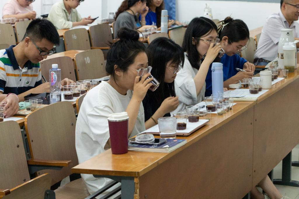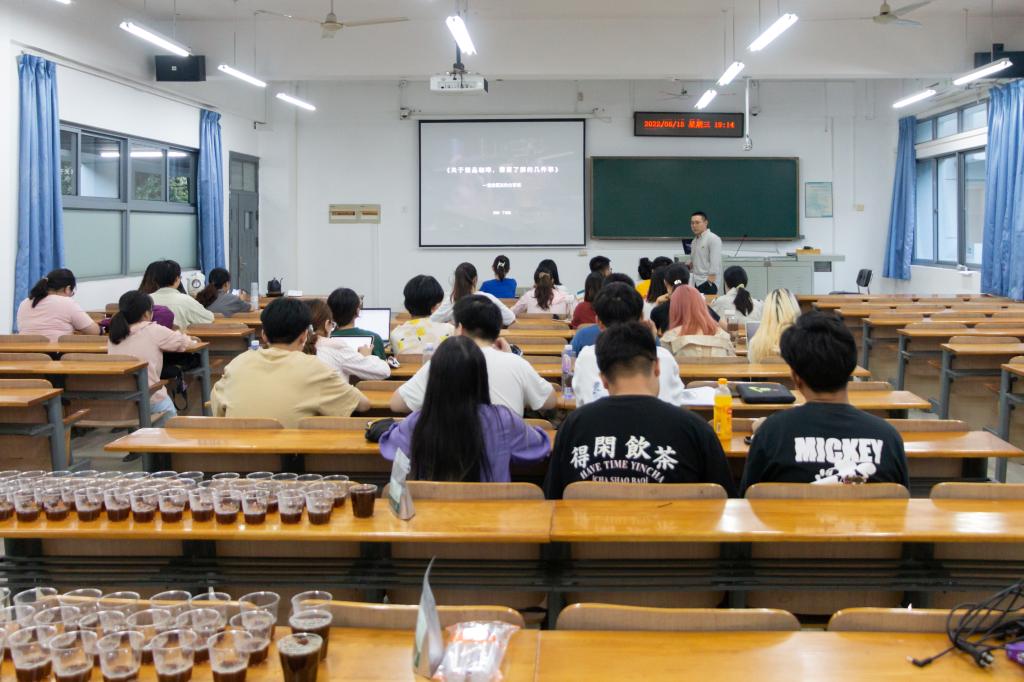 讲座中,丁哲然从咖啡是什么、如何分辨咖啡的好坏、咖啡的受众群体及咖啡产业评估四方面展开讲解。他讲到咖啡的生产需经种子、培育、采摘、处理、储存、烘焙、研磨及冲煮八个环节,特别提到树种的选择以及生豆的处理和储存,强调咖啡豆采摘后必须经过干燥,将含水量降至10%-12%才可出口。在提到如何分辨咖啡品质时,他谈到咖啡豆的品质和饮品的评判至关重要,企业收购时,每袋咖啡豆都会有诸如“印度尼西亚·虎曼庄园 曼特宁-日晒处理法 18目 ”的信息卡片来体现咖啡豆的品质。他表示,饮品评判则采用生豆体质评分体系,若评分超过80分,则咖啡豆被认定为精品咖啡豆。同时,工作人员将三杯不同的咖啡饮品分发给在场同学,同学们就干香或湿香、风味、酸度、醇厚度、一致性、平衡感、甜度等几方面对其进行品评。