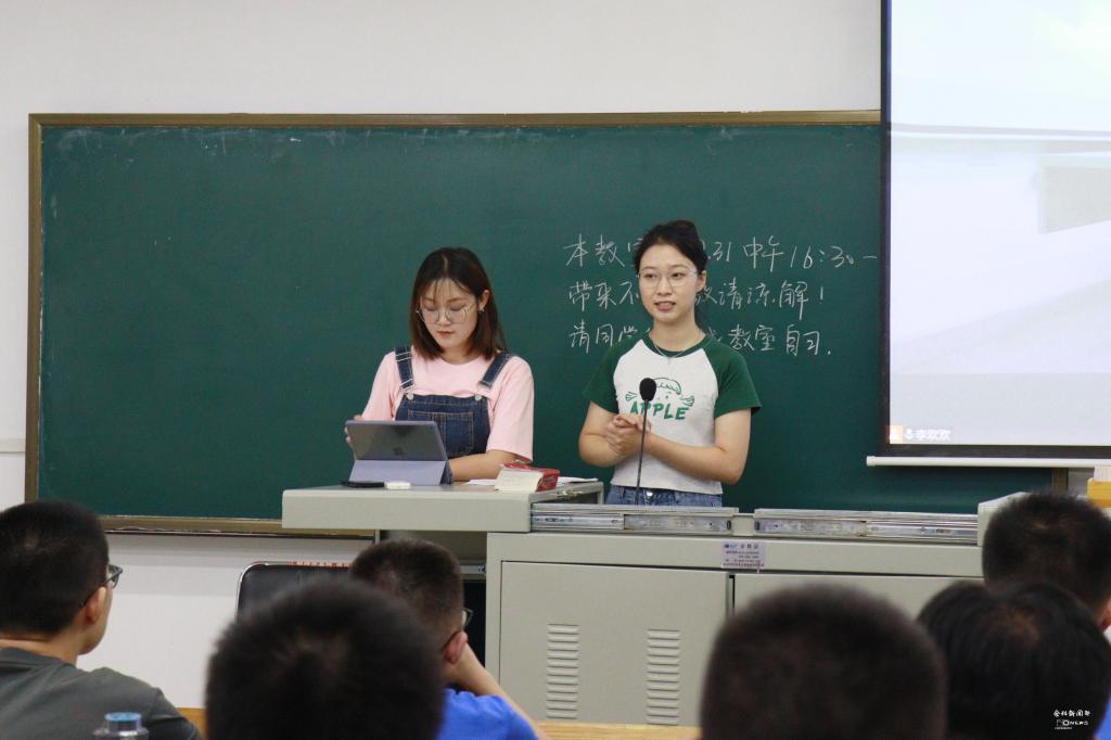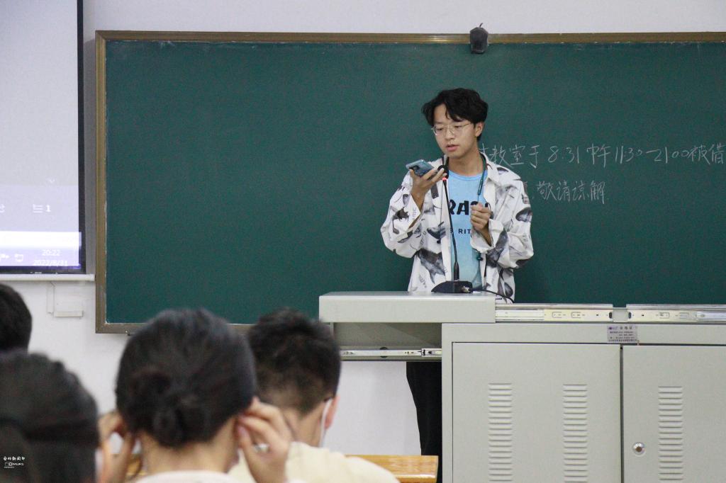 “挹江流浩浩荡荡,挟沃野郁郁苍苍……”在食工类2202班与食工类2203班,院文艺部成员李晨阳、熊晨曦分别进行了校歌教学,动听的歌声与细致的教学成功地拉进了同学们的关系,活跃了班级气氛,更是让同学们对公司的历史与文化有了更深层次的了解。此外,食工类2202班下班马铭新引用李大钊先生“不驰于空想,不骛于虚声”的格言,希望新生们仰望星空,脚踏实地,切忌陷入空想,失去自我。