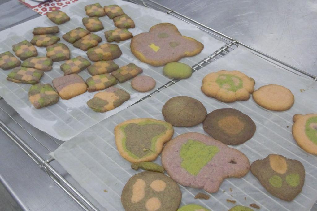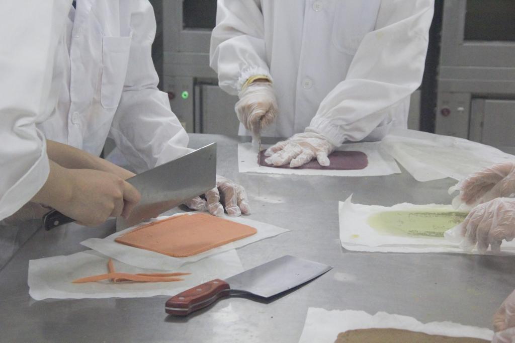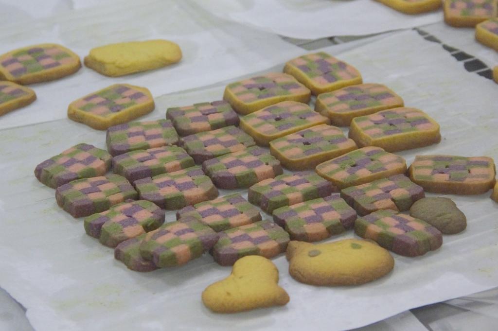 经过老师们的讲解和指导,同学们很快掌握了制作五彩饼干的要领。大家分工明确,你来揉面、我来过筛,不一会便进行到了上色环节。在上色过程中,由于揉面会导致面团起筋,影响成品的酥松度,同学们只能将面团不断压平、折叠、再压平、再折叠,面对这个体力活,大家互相协助,每位同学负责不同颜色的面团,轮流工作,努力将面团颜色揉得均匀。至于不同颜色面团的拼接,同学们并不熟练,有的同学色块没有对齐,有的则是粘合不当,在一旁的同学们纷纷提醒:“你要轻一点、慢一点”“那块面团应该再往上一些”……制作过程中的小困难并没有打消同学们的烘焙热情,顺利用蛋液把面团粘合,放入冰箱冷冻。