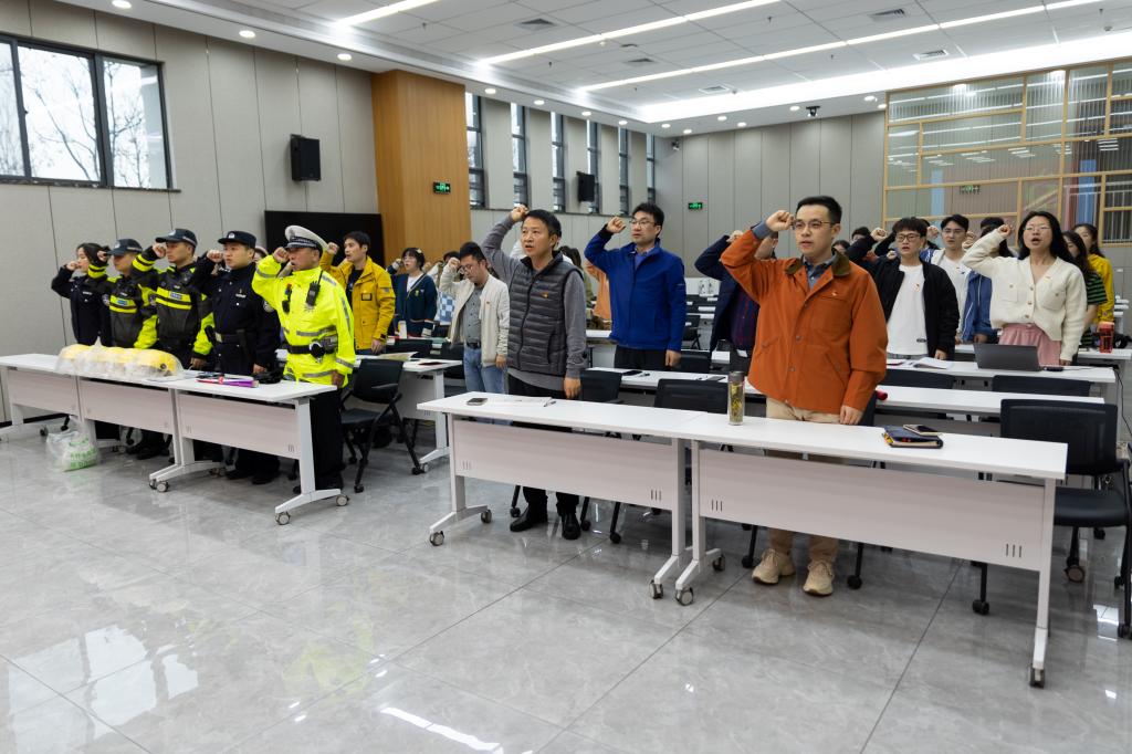 在交通模拟演示环节,校园管理办公室的同志结合校园特点,设计了非机动车包超机动车、机动车倒车盲区等多个场景。员工作为交通参与者进入模拟交通情景中,身临其境,亲身感受。付敬忠建议同学们从机动车驾驶人、非机动车驾驶人、乘车人和行人不同交通参与者的角度总结日常交通安全常识:如下车前要先观察路况,用远端手开车门、不要在大货(客)车前后穿行或车辆周围停留等等,要求同学们不仅要掌握这些交通安全常识,还要提高自身安全常识,规范交通行为,做到文明出行。