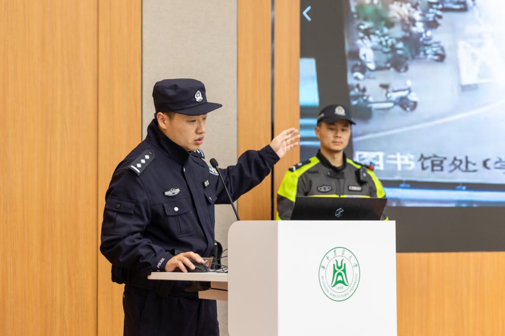 为了更好地达到交通安全的教育目的,汉警快骑机动队党支部书记付敬忠、支委郭俊成紧密结合近期发生在华农校内的交通事故案例,分析原因,总结如何规避交通事故带来的伤害。同时通过有奖问答的形式与同学们积极互动,引导同学们树立文明交通意识,遵守各项交通法律法规,做到安全出行。当提问到“四不”是什么的时候,食工类1902班戴浩驰做出积极回答。