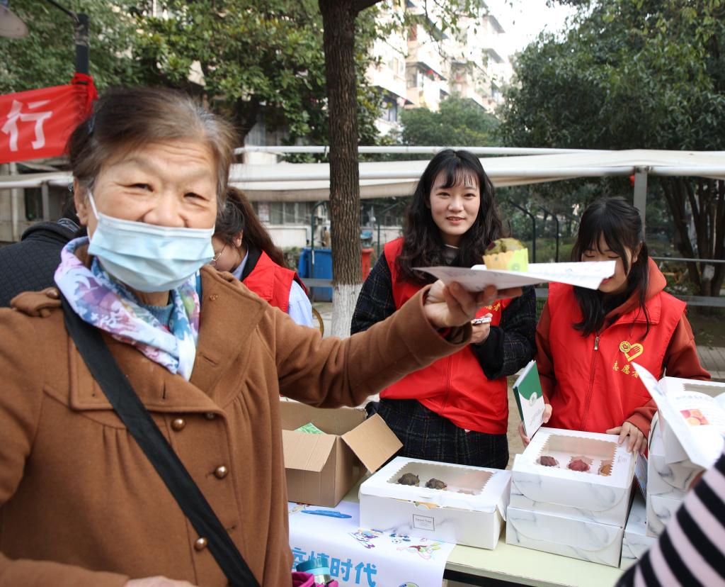 在科普区,志愿者给居民分发列有提高免疫力方法的宣传手册,借助宣传手册为他们进行知识科普。在答题区,居民则根据所了解的知识进行答题,完成之后每人将获得一份由志愿者亲手做的纸杯蛋糕作为小奖励。