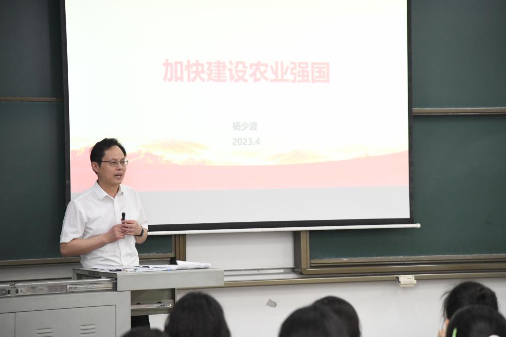 党的二十大提出了全面建设社会主义现代化强国总的战略安排。报告指出,全面建设社会主义现代化国家,首要任务是高质量发展,最艰巨最繁重的任务在农村,要全面推进乡村振兴,加快建设农业强国。4月18日上午,伟德党委常委、副董事长杨少波为伟德官网2022级本科生上了一堂生动的形势与政策课,阐述了加快建设农业强国的重要意义和主要内容。