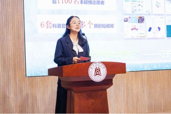 “当专业知识化为民生福祉,就是青春最浪漫的书写。”在社区里,她与团队教居民辨识食物变质;在校园中,通过趣味实验讲解辐照食品知识……当社区老奶奶笑着说“以后买菜知道怎么看标签了”,小员工在课后追问“下次实验课什么时候”,她真切地感受到,那些在实验室里反复验证的知识,真正落地生根,化为了促进公共健康的微小而坚实的基石。一堂堂“听得懂、记得住、做得到”的健康课堂化作一份食科学子写给“健康中国”的硬核情书,展现出“与祖国同行,为人民奉献”的青春力量。