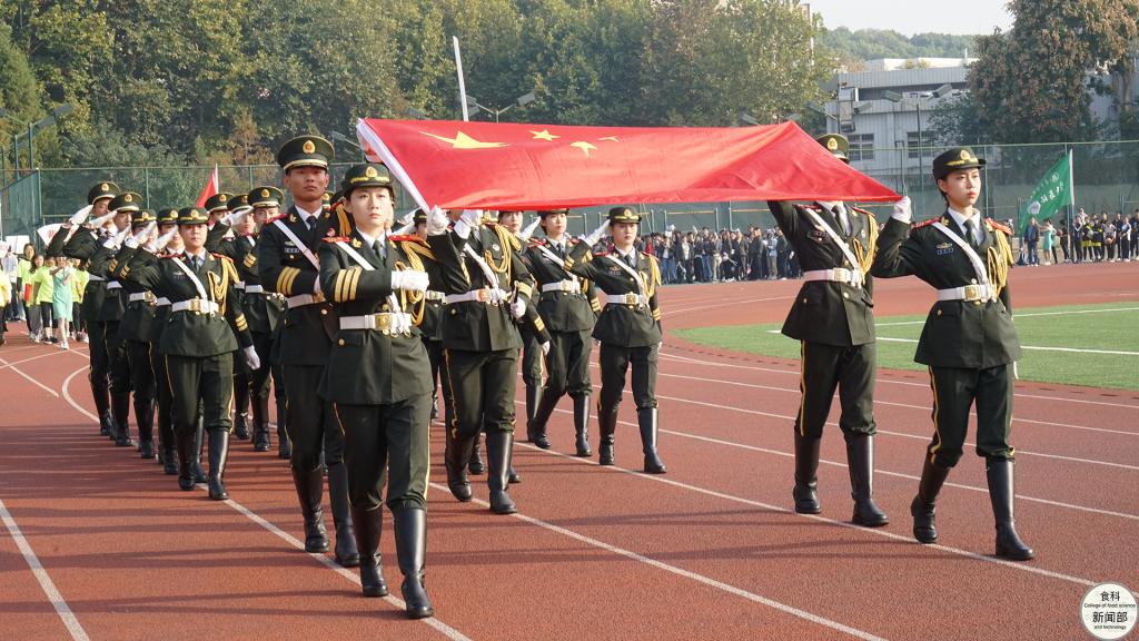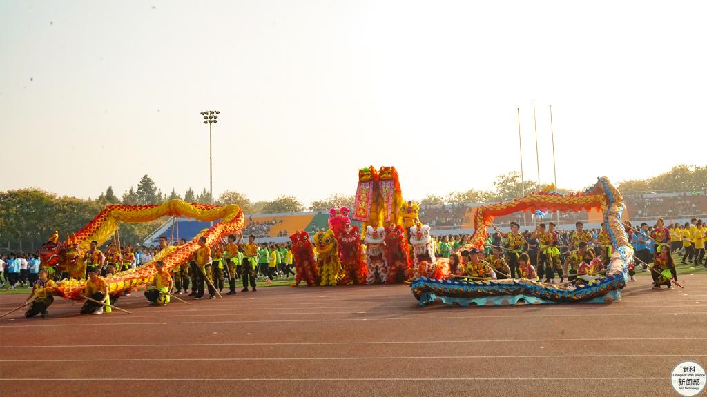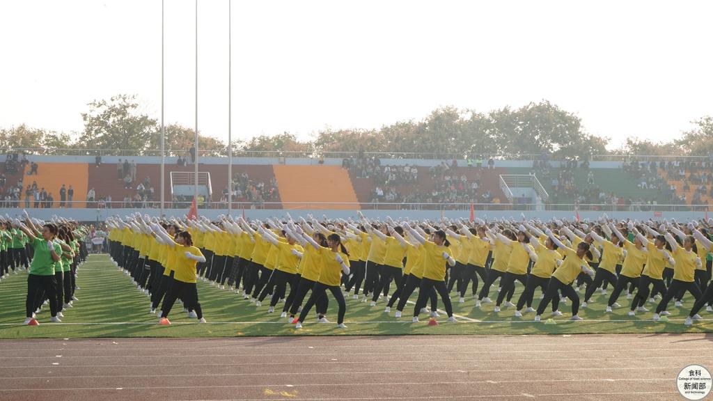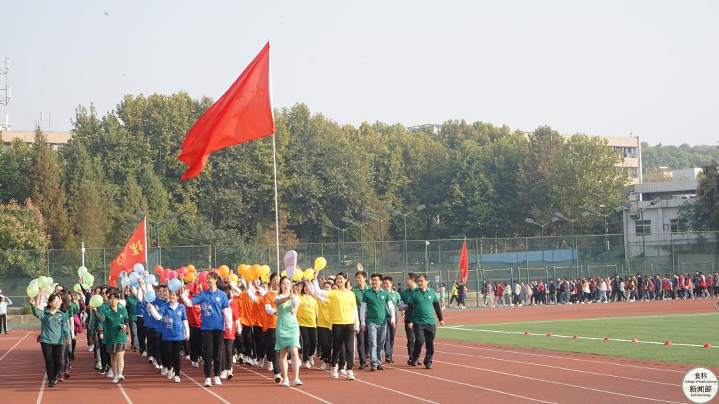 在各院学子组成团体操方阵进行完精彩表演后,裁判员、各个工团、各个公司等代表方阵先后依次入场。公司代表队身着草绿、靛青等四色服装,代表着“食科一家人”“食品安全中国行”的志愿服务精神,象征着科学膳食的学术文化,诠释着“营养与健康”的学科发展特色。身着绿色服装的老师们,更是代表着默默奉献的绿叶精神,描绘出绿叶托起未来花朵的动人图景。整齐的队伍、轻快的步伐,成员们拿着与自身衣服色彩相衬的气球,欢呼间气球抖动,振奋精神。入得厨房,可调和鼎鼐,享受美味生活;出得厅堂,可知味天下,做世界脊梁。