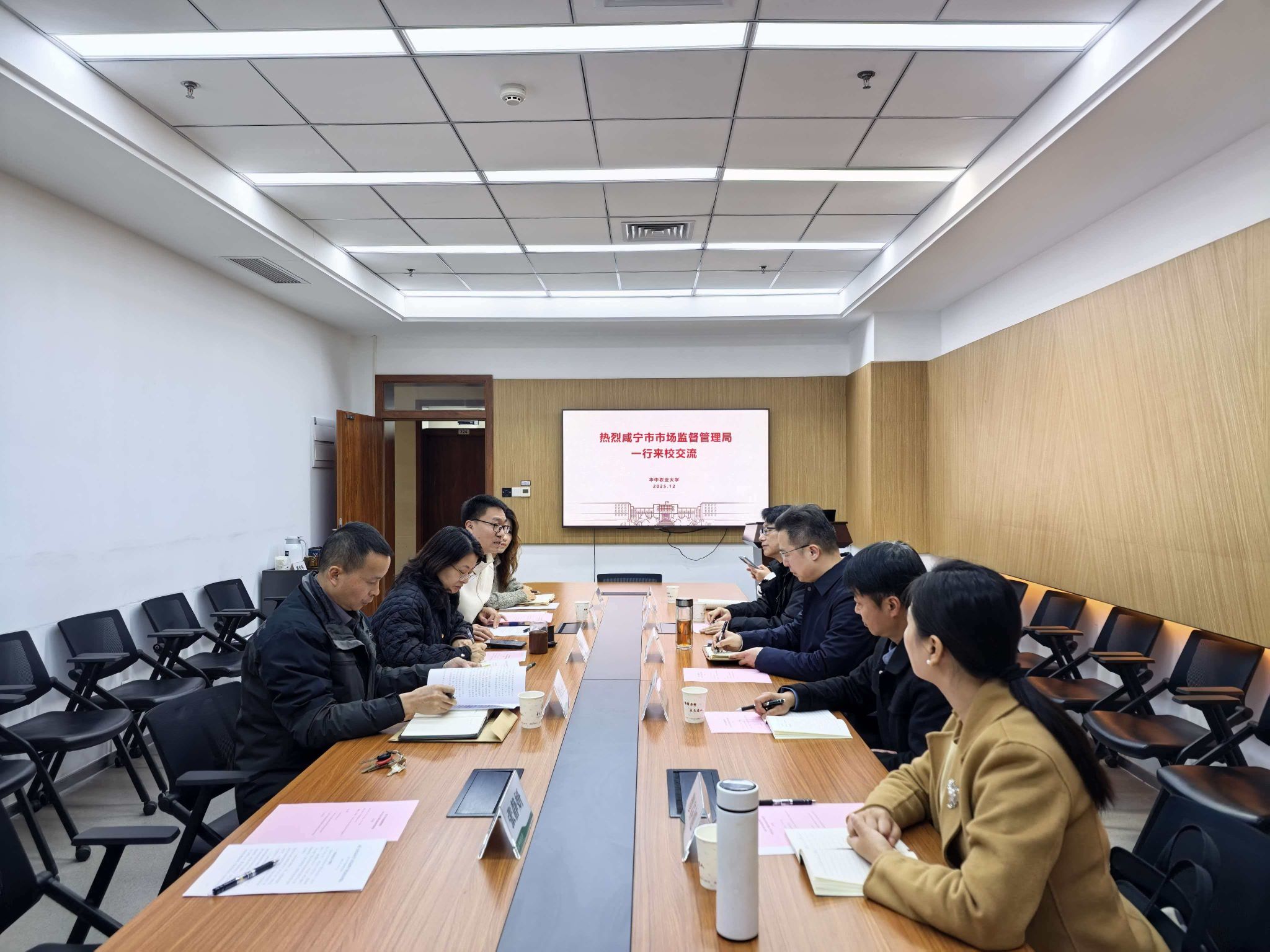 会议伊始,吕瑞凯简要介绍了公司及公司的发展历程、学科布局、社会服务、人才培养理念以及公司的四大研究方向与特色创新团队。方兆淼局长介绍了咸宁市作为“香城泉都”在食品产业与食品安全方面的基本情况,并表达了深化校地合作的强烈意愿。他提到,双方前期已在“食品安全与营养中国行”活动、“元气森林”实践基地建设等方面奠定了良好合作基础。他希望接下来能进一步拓展合作:加强食品饮料产业技术研究与服务,摸排企业技术需求,助力中小企业提质升级;推进干部培训与员工实践基地建设,开展系列食品安全培训,共建实习实训平台;推动科技成果在咸宁转化落地,促进食品饮料、生物医药产业发展;开展招商引资与项目合作信息对接;通过技术赋能提升食品安全监管效能;组织专场招聘会,吸引华农食品专业毕业生到咸宁就业创业。