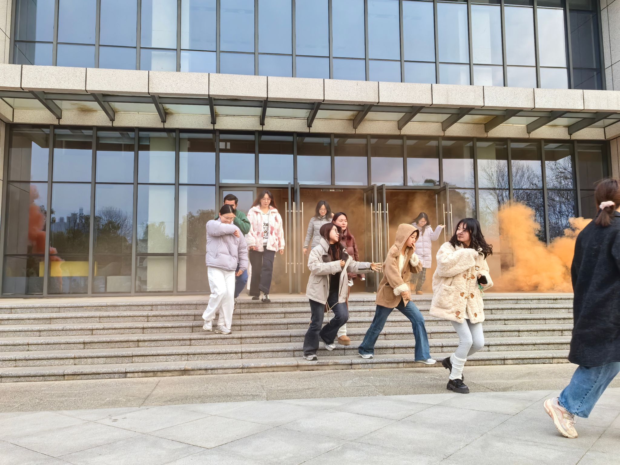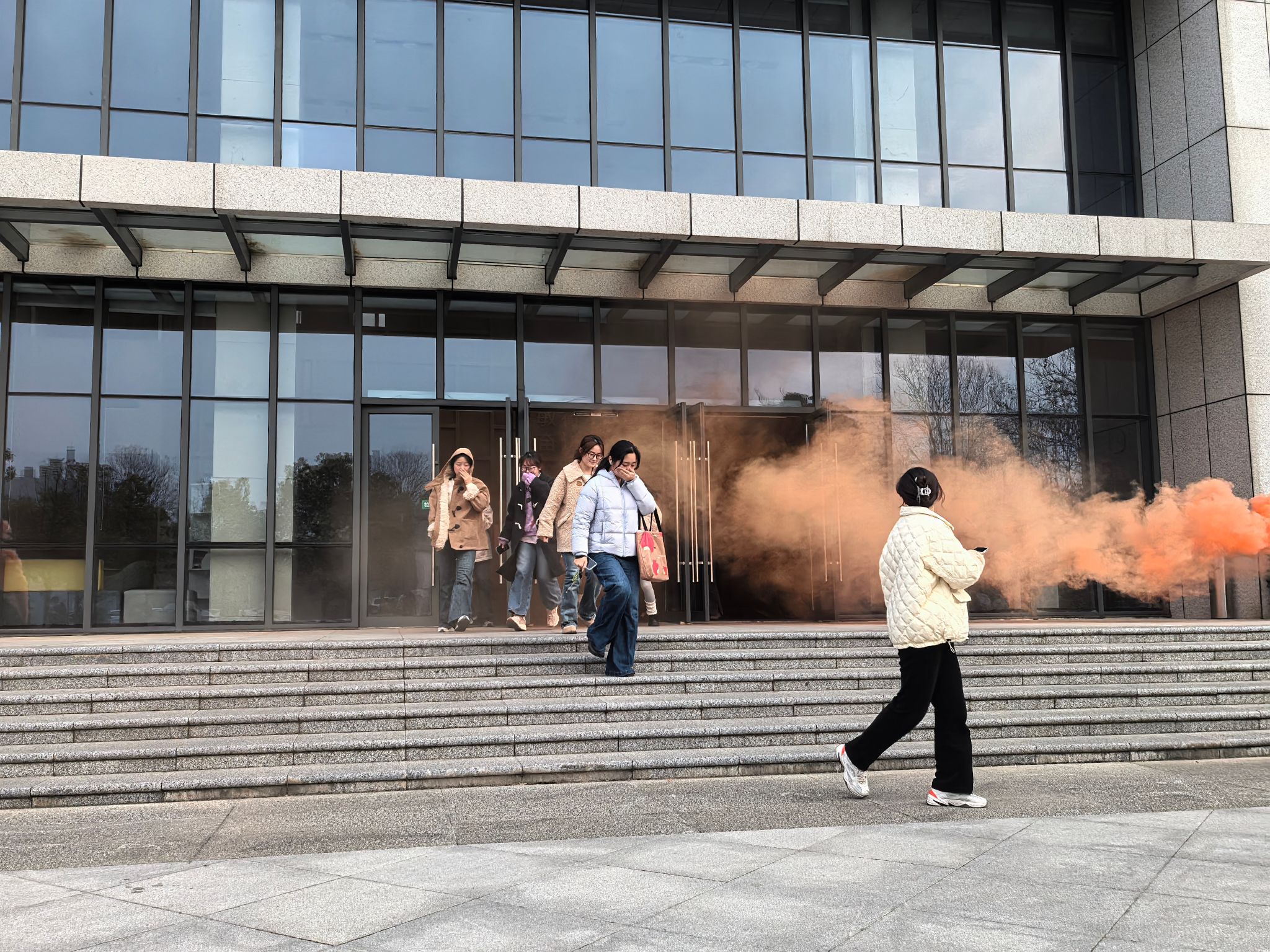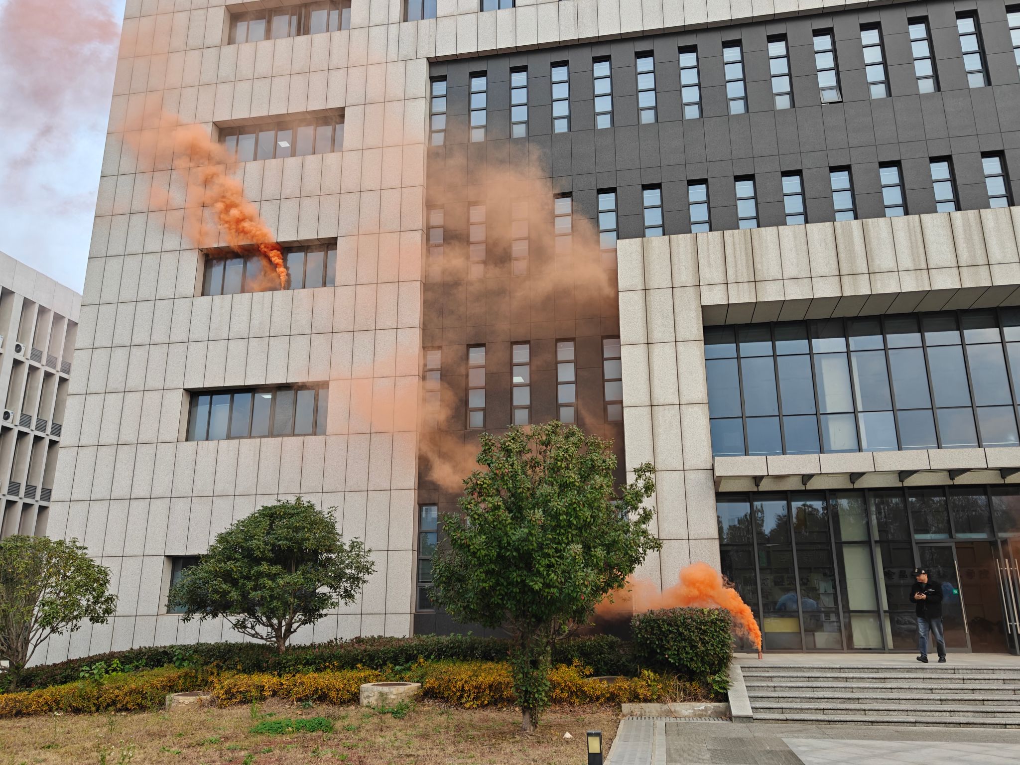下午16时,建安部工作人员通过楼内消防报警器发布指令,演练正式启动。楼内师生听到消防警报铃声立即进行疏散撤离。师生按照:实验室/自习室/办公室→走廊→疏散楼梯→安全出口→集结点(公司大楼前空地)的路线撤离,全程禁止乘电梯。