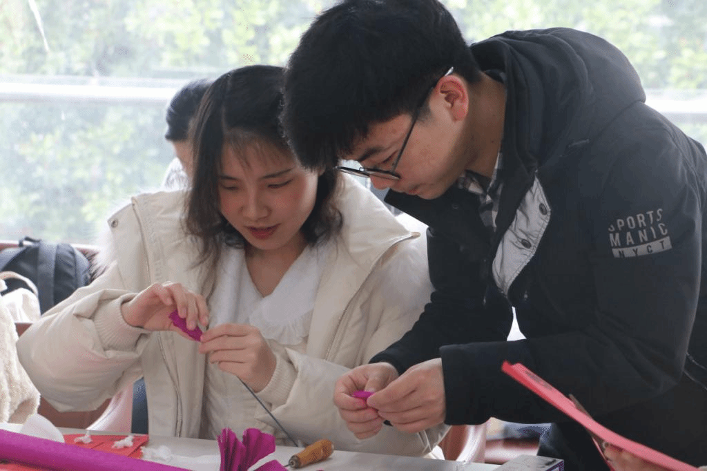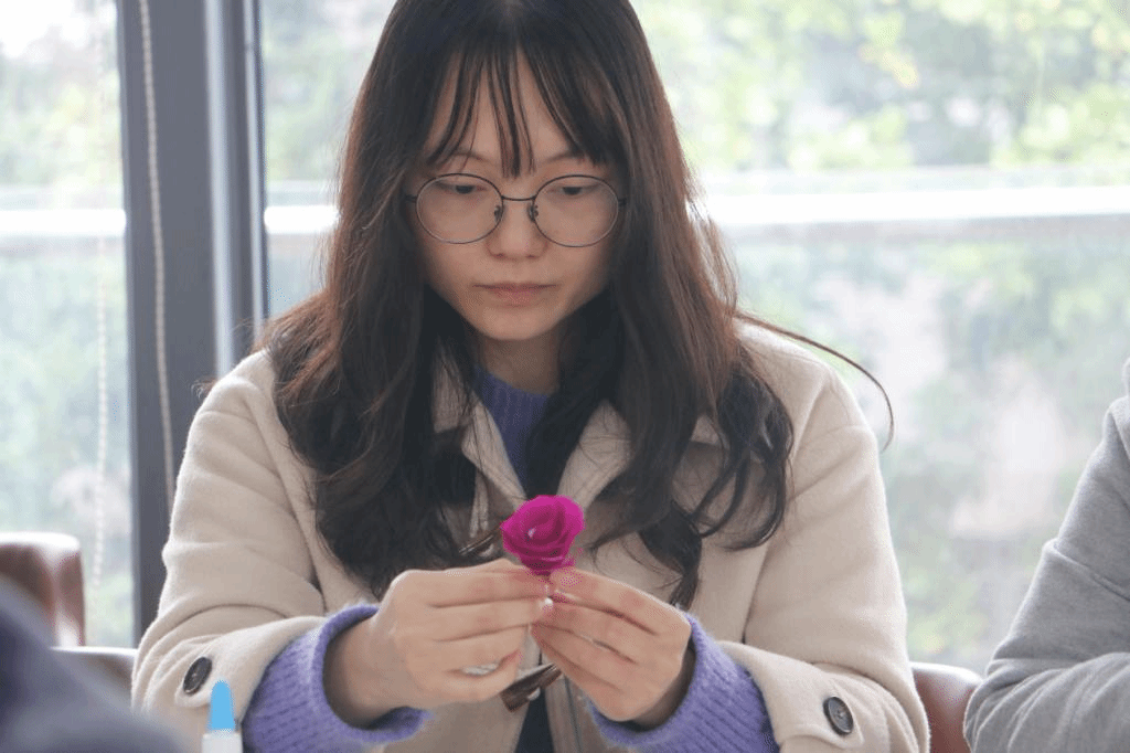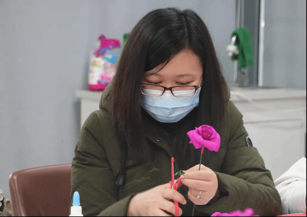 “我给实验室几个小伙伴每人都做了一朵玫瑰花,他们肯定会很喜欢。我还特意给男朋友准备了一份手工材料,希望他能为我做一朵玫瑰花呐!”现场的一位同学笑着说道。除了老师们参加此次活动外还有许多公司的同学们,她们与老师们一起用艺术的眼光和心态看待生活,用心倾听来自老师们的生活经验,对未来充满期待与欢喜。
