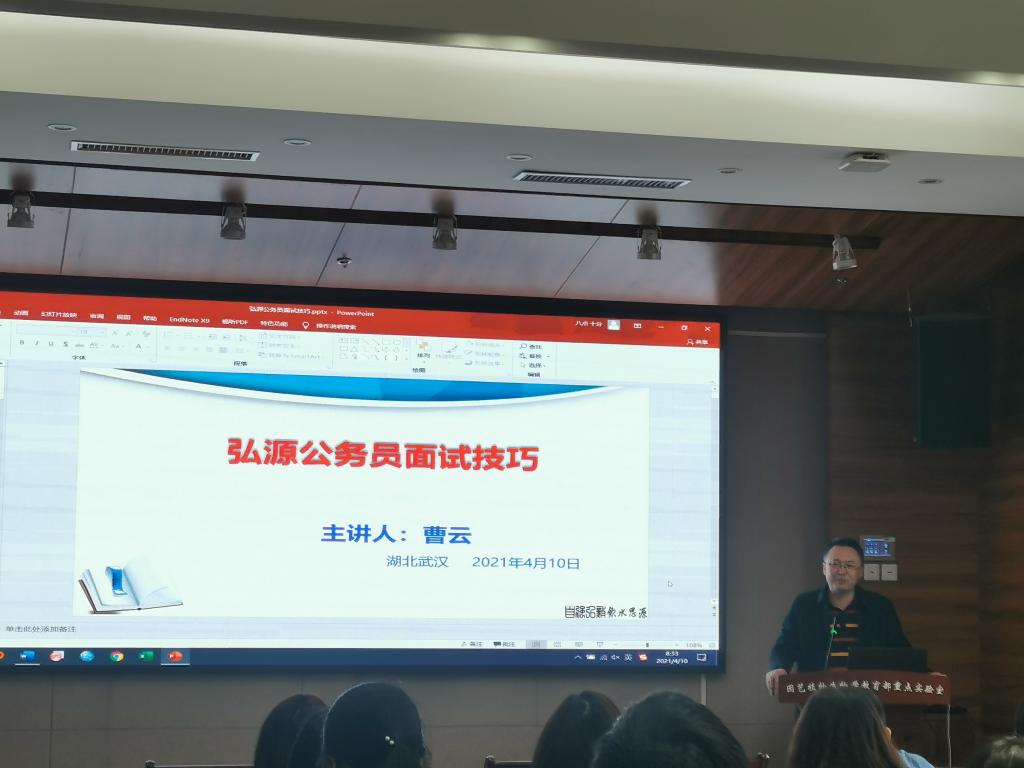 2021年4月10日,公司联合园艺林学公司、资源与环境公司在园林楼204会议厅和206活动室顺利举办“公务员面试专项训练”与“面试技巧分析及综合演练”活动。此次活动邀请公司优秀毕业生曹云师兄以讲座和实练的方式与同学们交流互动,旨在帮助同学们开阔思路,熟悉面试流程,掌握在面试中的宝贵技巧。