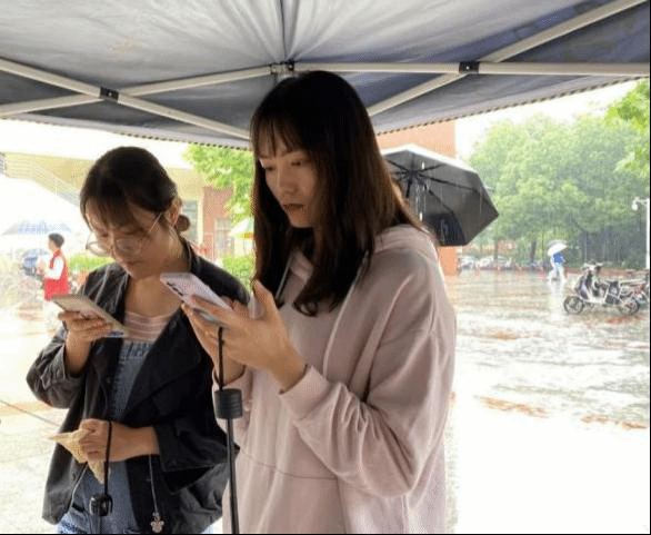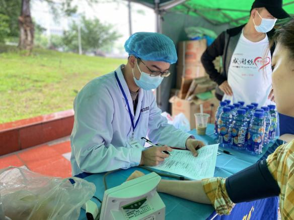 虽然外面下着大雨但是浇不灭同学们献血的热情,大家陆陆续续来到献血车前的帐篷中,开始进行献血前的准备工作。帐篷上的积水时不时倾泻而下,打湿了同学们的衣服,却没有人因为大雨中的等待而放弃。瓢泼的大雨未能阻挡第一党支部的党员志愿者们在雨中来回穿梭,耐心的为每一位献血者讲解献血的步骤和注意事项。
