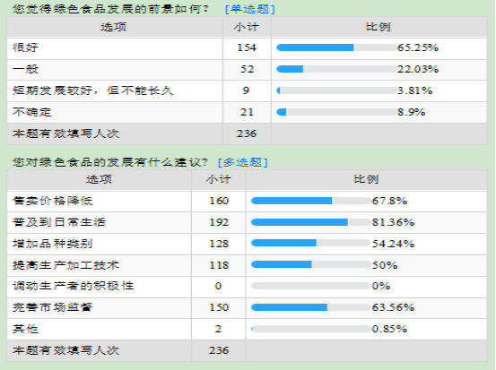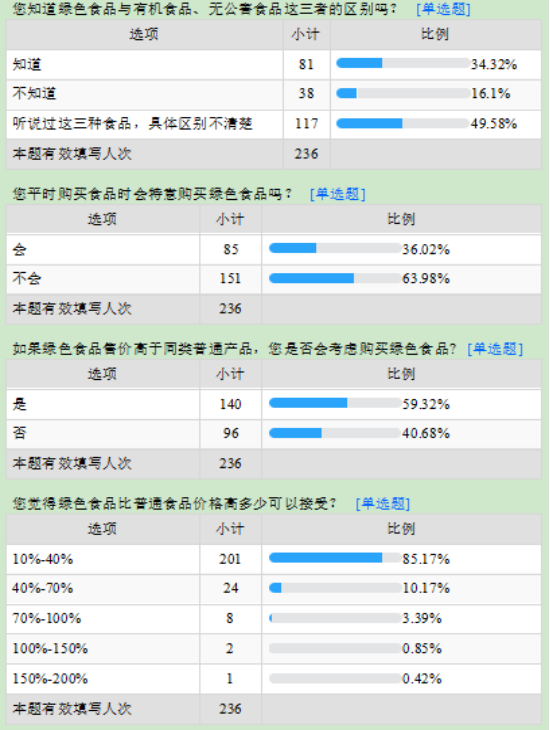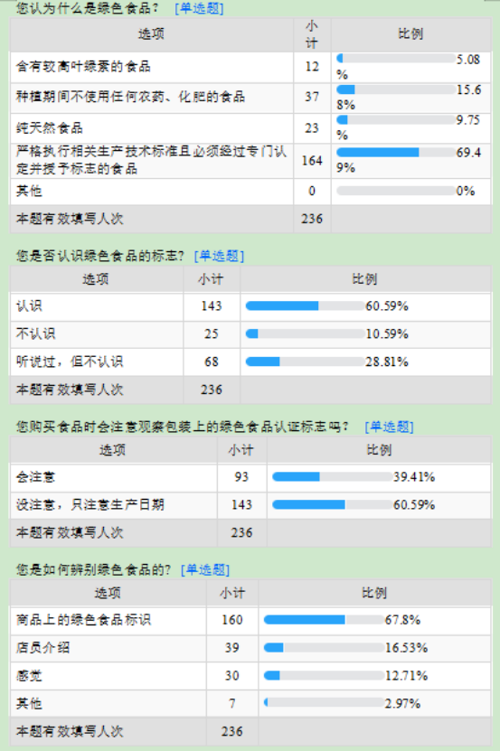 结果显示,准确知道绿色食品含义的占比53.25%,仍然有近50%的人不清楚或者不知道绿色食品的含义;近31%的人仍不能准确辨别绿色食品,认为含有较高叶绿素、种植期间不使用任何农药和化肥的食品以及纯天然食品等是绿色食品,说明他们在辨别绿色食品时依然存在误区;此外,在购买食品时,60.59%的人不会去留意绿色食品的认证标识;关于如何辨别绿色食品,67.8%的人会通过商品上的绿色食品标识来辨别绿色食品,16.53%的人通过店员介绍、12.71%凭感觉、还有2.97%的人选择其他方式来辨别绿色食品;仅34.32%的人明确知道绿色食品与有机食品、无公害食品的区别,大部分人不清楚或者不知道他们三者的关系;关于绿色食品的购买意向,63.98%的人表示平时不会特意购买绿色食品,59.32%的人表示当绿色食品的售价高于同类普通产品时仍会选择购买绿色食品,此外关于绿色食品相比普通食品的定价,85.17%的人表示当绿色食品比普通食品价格高10%-40%时可以接受;65.25%的人认为绿色食品具有很好的发展前景;关于绿色食品发展的建议,81.36%的人认为应该将绿色食品普及到日常生活,67.8%的认为应该降低绿色食品的售卖价格,63.56%的人认为应该完善市场监督,54.24%的认为应该增加品种类别。