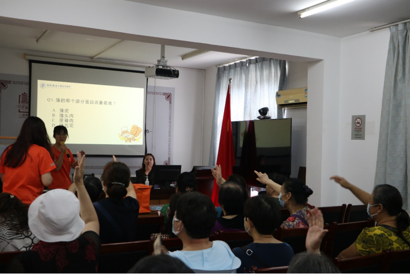 科普讲堂结束后,主持人丁礼贤根据讲解的内容与居民开展互动问答。如何辨别坏肉?如何解冻冷冻肉?居民们踊跃回答,分享自己的生活经验。互动结束后,博士团为老人们分发了礼品。