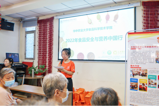 7月22日上午,“食品安全与营养中国行”的下一站来到了美丽的水陆社区。以“夏日食品安全与饮食建议”为主题开展了一场食品安全与营养科普互动讲堂。此次活动由博士团志愿者李琪琪主持,志愿者张馨月主讲,水陆社区居家养老服务中心的三十余名老人参与本次宣讲活动。