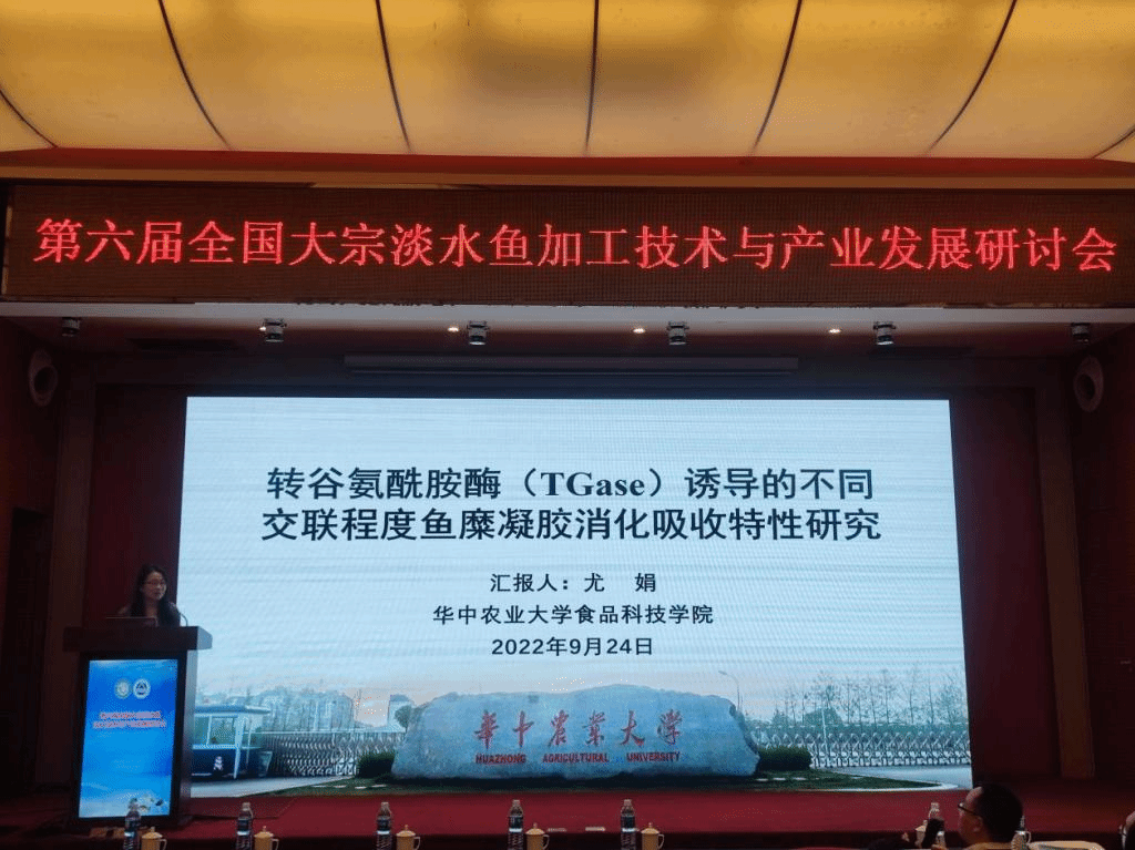 期间,伟德食品大分子结构与功能特性团队的熊善柏教授在大会上作了题为《池塘养殖草鱼的提质、调理加工与保鲜技术》的报告,指出我国淡水品种池塘养殖比例高、加工率低的现状,且淡水鱼产业目前存在的问题在于鲜活销售风险大、产品品质不稳定以及鱼肉土腥味较重,故技术开发思路应集中在净化提质、低温保鲜以及冷链物流三个方面。经过团队的前期努力,实验室建立了微流水净化提质技术、鱼制品调理保鲜技术以及调理鱼增鲜去腥技术。随后,尤娟、尹涛、胡杨、安玥琦分别作了题为《转谷氨酰胺酶TGase诱导的不同交联程度鱼糜凝胶消化吸收特性研究》、《淡水冷冻鱼糜特性及加工技术》、《EGCG/TGase对鱼糜凝胶物性调控的协同增效机制研究》、《风味物质在不同交联度鱼糜制品中的释放与调控》的报告,分享了团队近年来围绕鱼糜及鱼糜制品风味与品质调控的研究进展,得到了与会专家的认可与好评。