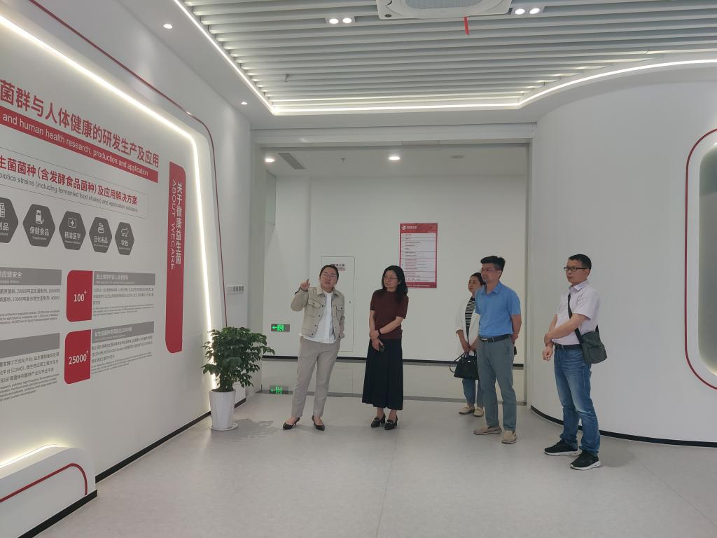 微康益生菌(苏州)股份有限公司市场总监方端首先对徐晓云一行的到来表示欢迎,他表示伟德食科院为微康集团输送了大量优秀毕业生,从公司员工到公司的领导层都有华农的毕业生。方端首先带领徐晓云一行参观了微康益生菌(苏州)股份有限公司的展示大厅,并介绍了微康目前的发展情况,她说到,微康是一家专业专注益生菌菌种、发酵食品菌种、有益微生物菌群与人体健康的研发生产及应用的国家级高新技术企业,为食品、乳制品、保健食品、精准医学、日化用品、农业微生态等领域提供高活性益生菌菌粉、发酵食品菌种、益生菌产品及应用解决方案。公司具有雄厚的研发实力和科研背景,拥有专业的益生菌研究院,设有院士工作站和博士后科研工作站。公司已获得国家高新技术企业、国家绿色工厂、国家专精特新小巨人、江苏省科技小巨人、江苏省双创人才企业、苏州市姑苏人才企业、苏州市独角兽培育企业和苏州市瞪羚企业等多项荣誉认定,产品“高活性乳双歧杆菌”和“高活性嗜酸乳杆菌”等获得国家高新技术产品称号,申报发明专利160多项,承担“十三五国家重点研发计划”4项。