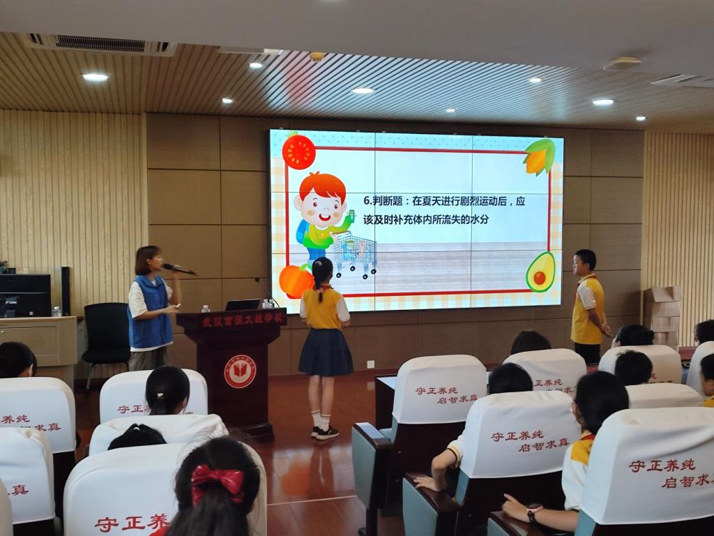 活动现场,博士科普团的志愿者围绕“夏季应该吃什么?”这个问题以及宣讲中所提及的暑期膳食营养与安全相关内容与现场的同学们们进行互动。主讲人向仕霞为同学们讲述了五大营养素的知识和平衡膳食的原则,同学们纷纷表示记住了五大营养素分别是碳水化合物、脂肪、蛋白质、维生素和矿物质。随后,志愿者向同学们提出了“夏季大家应该吃什么?”的问题,小朋友异口同声回答:“西瓜!”志愿者也为同学们科普了夏天应该多吃粥、寿司和西瓜、草莓等水果,还要多喝奶昔、果汁和水。之后同学们学习了夏季饮食“5要5不要”、夏季饮食“六”原则和一些生活小技巧。最后在“小小营养师”的问答活动中,志愿者请到了两位同学代表展开了答题活动,最后来自四年级三班的小朋友拔得了头筹,现场气氛十分活跃。